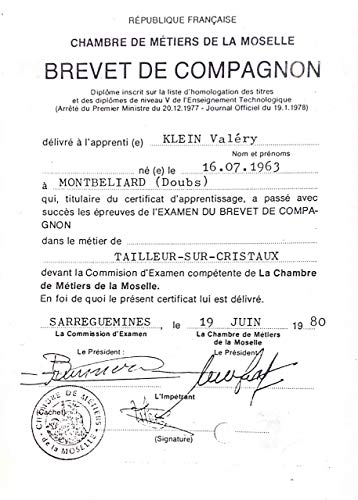 - Pequeña empresa familiar la Maison Klein, Valéry Klein Compagnon desde 1980 ha producido siempre cada pieza con una preocupación por la perfección máxima « Siempre prefiero la calidad a la cantidad, una tradición que tengo de mi padre. ¡Él fue quien me transmitió el amor por el trabajo bien hecho! » Cada creación debe traer placer visual, ¡pero no solo! También debe pasar un control de calidad muy estricto antes de salir del taller y ser tan agradable a la vista como de usar.