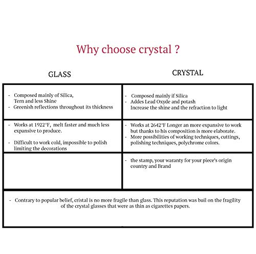 - El cristal es tan fuerte como el cristal. El cristal de color se llama «cristal doble», Está hecho íntegramente a mano para permitir un brillo mágico y acabados imprescindibles en el arte de la mesa.