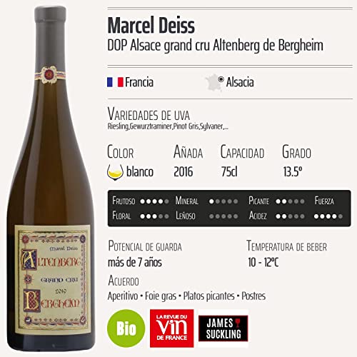 El Alsace grand cru Altenberg de Bergheim Moelleux blanco 2016 es una joya enológica que combina la tradición y la innovación en cada sorbo. Proveniente de la prestigiosa DOP Alsacia, Francia, este vino orgánico de Marcel Deiss es ideal para los amantes del vino que buscan una experiencia única. Con una mezcla de variedades de uva como Riesling, Gewurztraminer y Pinot Gris, este vino dulce y aromático resulta perfecto para acompañar postres, quesos suaves o simplemente disfrutar en una ocasión especial.