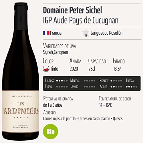 Descubre el Aude Pays de Cucugnan Les Jardiniers tinto 2020, un vino orgánico de Domaine Peter Sichel que proviene de la encantadora región de Languedoc Rosellón en Francia. Este vino tinto, elaborado con las variedades de uva Syrah y Carignan, ofrece una experiencia única para los amantes del vino y para aquellos que buscan un producto sostenible y respetuoso con el medio ambiente. Ideal para maridar con carnes rojas, platos de caza o incluso una buena tabla de quesos, este vino es perfecto para celebraciones, cenas familiares o simplemente para disfrutar en una noche tranquila.