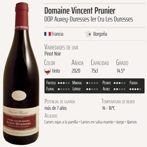 Los amantes del vino que han probado el Auxey-Duresses 1er Cru Les Duresses tinto 2020 de Vincent Prunier destacan su calidad excepcional. "Un vino de carácter y profundidad, perfecto para una cena especial", señala un usuario en una reseña. Otro añade: "La suavidad de sus taninos y su frescura lo convierte en uno de mis favoritos. Definitivamente, repetiré la compra". Con una valoración media de 4.8 de 5 estrellas en diversos sitios de venta, este vino ha conquistado el paladar de muchos, solidificando su lugar en la alta gastronomía.