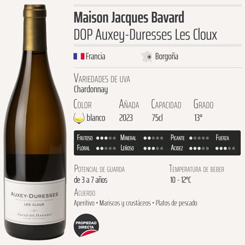 Este vino de la Maison Jacques Bavard se caracteriza por su frescura y sofisticación. Proveniente de viñedos con condiciones ideales de clima y suelo, el Chardonnay utilizado en este Auxey-Duresses Les Cloux ofrece notas florales y frutales, acompañadas de un sutil toque mineral. Su proceso de vinificación cuidadoso resalta la pureza de la uva, resultando en un vino bien equilibrado que presenta una acidez refrescante y un final persistente. Perfecto para maridar con mariscos, aves y quesos suaves, este vino es una elección versátil para cualquier mesa.