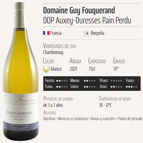 El Auxey-Duresses Pain Perdu blanco 2021 destaca por su vibrante frescura y complejidad. Su color amarillo pálido con destellos dorados anticipa una experiencia sensorial inigualable. En nariz, ofrece una mezcla aromática de frutas cítricas, flores blancas y notas sutiles de vainilla, resultado de su cuidadosa crianza. En boca, su acidez equilibrada y su final persistente lo convierten en un vino versátil que realza cualquier plato, desde mariscos hasta aves y quesos finos. Este vino es una expresión auténtica del terroir borgoñón, reflejando el compromiso del Domaine Guy Fouquerand con la calidad y la tradición vinícola.