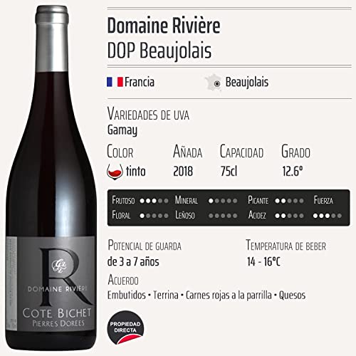 Este Beaujolais Côte Bichet Pierres Dorées tinto 2018 se destaca por su elegante color rojo rubí y su bouquet aromático que combina notas de frutas rojas frescas, como cerezas y frambuesas, con un ligero toque floral. Su paladar equilibrado y vibrante, junto con una acidez refrescante, lo hace versátil tanto para platos de carne como para aperitivos. Elaborado en un terroir excepcional, este vino refleja la esencia del Beaujolais y la maestría enológica del Domaine Rivière, que lo convierte en un exponente de calidad en su categoría.