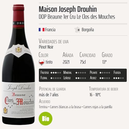 Descubre el exquisito Beaune 1er Cru Le Clos des Mouches tinto 2021, un vino orgánico de la prestigiosa Maison Joseph Drouhin, reconocido bajo la Denominación de Origen Protegida (DOP) de Borgoña, Francia. Este selecto vino, elaborado exclusivamente con la variedad de uva Pinot Noir, sorprende con su elegancia y complejidad. Ideal para amantes del vino que buscan una experiencia única, perfecta para acompañar cenas especiales o disfrutar en momentos de relajación.
