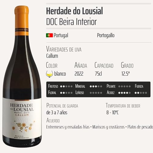 El Beira Interior Callum Reserva blanco 2022 se distingue por su excepcional calidad. Elaborado con variedades de uva Callum, este vino presenta un equilibrado bouquet de aromas frutales y florales, con notas de limón, manzana verde y un toque sutil de hierbas frescas. Su acidez equilibrada y su final mineral proporcionan una frescura inigualable, convirtiéndolo en una opción versátil para maridar con mariscos, pescados y platos ligeros. Además, su proceso de crianza en barricas de roble le otorga una complejidad y un carácter sofisticado que deleitará a los paladares más exigentes.