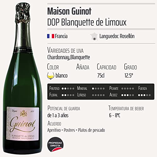 Descubre la exquisiteza de la Blanquette de Limoux Select blanco de Maison Guinot, una joya vitivinícola de la región de Languedoc Rosellón, Francia. Este vino espumoso con DOP está elaborado con las finas variedades de uva Chardonnay y Blanquette, ofreciendo un equilibrio perfecto entre frescura y complejidad. Ideal para los amantes del vino que buscan una experiencia única, este producto es perfecto para celebraciones, cenas elegantes o simplemente para disfrutar en buena compañía.