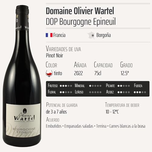 Descubre el Bourgogne Epineuil tinto 2022 de Domaine Olivier Wartel, un vino DOP originario de la renombrada región de Borgoña en Francia. Este excelente vino tinto, elaborado a partir de la variedad de uva Pinot Noir, ofrece un perfil de sabor elegante y sofisticado, ideal para amantes del vino que buscan una experiencia auténtica. Perfecto para acompañar una cena especial o para disfrutarlo en una reunión con amigos, este vino cautiva por su calidad, lo que lo convierte en una opción recomendada tanto para conocedores como para aquellos que desean adentrarse en el fascinante mundo del vino francés.