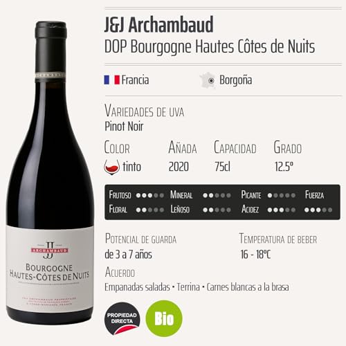 Descubre el Bourgogne Hautes Côtes de Nuits tinto 2020 – Orgánico de J&J Archambaud, un vino que resalta la herencia vitivinícola de Borgoña, Francia. Este tinto, elaborado con las selectas uvas de la variedad Pinot Noir, es ideal para los amantes del vino que buscan productos orgánicos de alta calidad. Su sabor sofisticado y equilibrado lo convierte en la elección perfecta para acompañar una cena elegante o disfrutar en una ocasión especial. Este pack de 6 botellas de 75 cl es ideal tanto para coleccionistas como para aquellos que simplemente desean disfrutar de un buen vino.