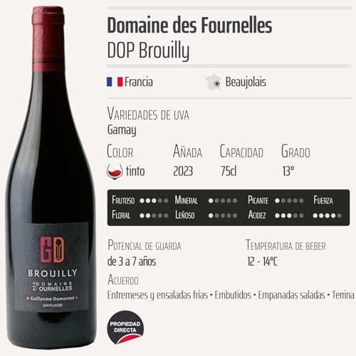 Descubre el Brouilly La Perrière tinto 2023 del Domaine des Fournelles, un vino de denominación de origen protegida (DOP) Beaujolais, que representa lo mejor de la tradición vinícola francesa. Este exquisito vino tinto, elaborado con las selectas uvas Gamay, es ideal para los amantes del vino que buscan una experiencia auténtica y rica en matices. Su perfil fresco y afrutado lo convierte en la elección perfecta para maridar con platos variados, desde carnes a la parrilla hasta quesos curados.