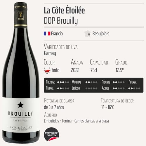 Descubre el Brouilly Les Pierreux tinto 2022 – La Côte Étoilée, un vino excepcional de la DOP Beaujolais en Francia que encantará a los amantes del vino. Elaborado con la variedad de uva Gamay, este vino tinto se presenta en un pack de 6 botellas de 75 cl, perfecto para disfrutar en ocasiones especiales o para compartir con amigos y familiares. Su frescura y elegancia lo convierten en la elección ideal para aquellos que buscan una experiencia de cata auténtica y memorable.