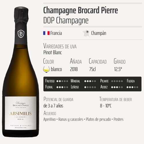 Descubre el Champagne Absimilis Extra Brut blanco 2018 de Champagne Brocard Pierre, una joya de la DOP Champagne en Francia. Este excepcional champán, elaborado con la variedad de uva Pinot Blanc, es ideal para aquellos que buscan una experiencia burbujeante refinada, perfecta para celebraciones, cenas sofisticadas o simplemente para disfrutar de un momento especial. Su carácter elegante y fresco lo convierte en la opción perfecta para los amantes del champán y la alta gastronomía.