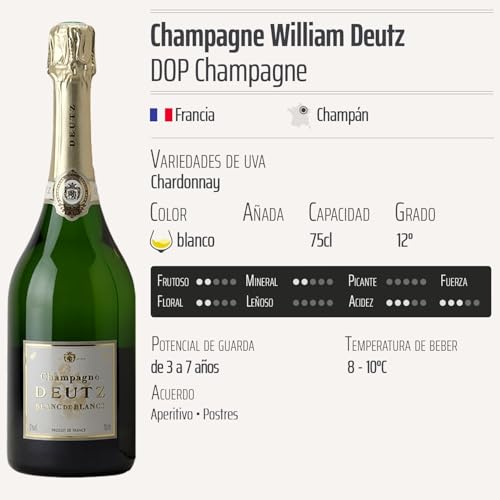 Descubre el Champagne blanco de Blancs COFFRET de Champagne William Deutz, un vino espumoso que representa la elegancia y la tradición de la mejor champagne de Francia. Con una cuidada selección de uvas Chardonnay, este champán de 75cl es ideal para ocasiones especiales, celebraciones o simplemente para disfrutar de un momento único. Su sabor refinado y su burbujeante frescura están dirigidos tanto a conocedores del vino como a aquellos que desean explorar el placer de disfrutar un gran champagne.