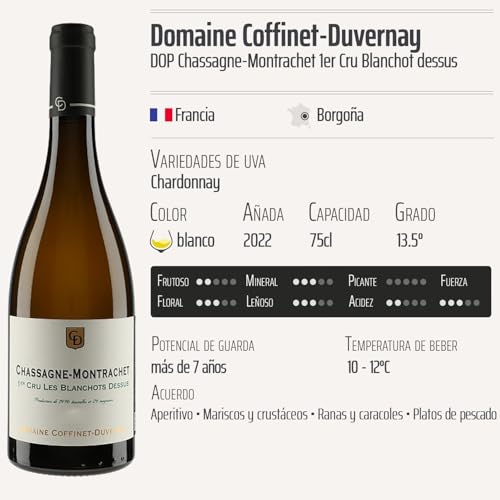 Descubre el prestigioso Chassagne-Montrachet 1er Cru Blanchot dessus blanco 2022, elaborado por el renombrado Domaine Coffinet-Duvernay en la reconocida región de Borgoña, Francia. Con su DOP que garantiza la calidad excepcional de sus uvas Chardonnay, este vino blanco es ideal para los amantes del buen vino que buscan una experiencia única en cada copa. Perfecto para ocasiones especiales, celebraciones íntimas o simplemente para disfrutar de un momento de placer, este vino es una elección que deleitará a los paladares más exigentes.