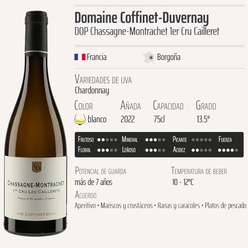 Descubre el Chassagne-Montrachet 1er Cru Cailleret blanco 2022 de Domaine Coffinet-Duvernay, una joya de la región de Borgoña, Francia. Este vino blanco, elaborado exclusivamente con uvas Chardonnay, es ideal para los amantes de los vinos finos que buscan una experiencia de degustación excepcional. Su blend equilibrado y su elegancia lo convierten en la elección perfecta para ocasiones especiales o simplemente para disfrutar de una copa en casa.