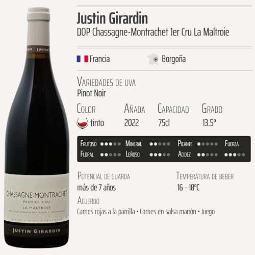 Descubre el magnífico Chassagne-Montrachet 1er Cru La Maltroie tinto 2022 de Justin Girardin, un vino tinto de denominación de origen protegida (DOP) que proviene de la prestigiosa región de Borgoña, Francia. Con su exquisita mezcla de uvas Pinot Noir, este vino es perfecto para los amantes del buen vino y la gastronomía, ideal para acompañar momentos especiales o como regalo sofisticado. Su rica herencia y su elaboración artesanal lo convierten en una joya para coleccionistas y aficionados a los vinos finos.