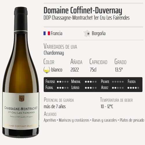 El Chassagne-Montrachet 1er Cru Les Fairendes blanco 2022 se caracteriza por su balance perfecto entre acidez y notas frutales. Con un color amarillo pálido brillante y reflejos dorados, presenta aromas de flores blancas, frutas de hueso y toques sutiles de roble que enriquecen su bouquet. En boca, es untuoso y meloso, con una mineralidad que resalta su origen borgoñón. Este vino refleja el terroir único de la región y la dedicación del Domaine Coffinet-Duvernay, que combina tradición con técnicas de vinificación modernas para ofrecer un producto excepcional.
