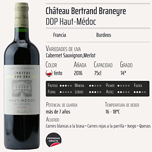 Château Bertrand Braneyre Vieilles Vignes tinto 2016 es una joya vinícola de la reconocida DOP Haut-Médoc, en la prestigiosa región de Burdeos, Francia. Elaborado a partir de uvas de variedades seleccionadas como Cabernet Sauvignon y Merlot, este vino tinto se presenta en un formato de 6 botellas de 75cl, ideal tanto para coleccionistas como para aquellos que desean disfrutar de una copa excepcional en ocasiones especiales. Este vino es perfecto para amantes del vino que buscan una experiencia rica y plena, con un perfil aromático que deleitará los paladares más exigentes.