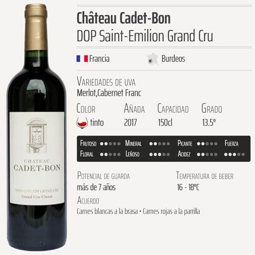 Château Cadet-Bon Saint-Emilion Grand Cru MAGNUM tinto 2017 destaca por su complejidad y armonía en cada sorbo. Este vino presenta un hermoso color rojo rubí profundo y ofrece en nariz intensas notas de frutos rojos maduros, como ciruelas y cerezas, complementadas con sutiles matices de especias y toques terrosos. Su paladar es elegante, con taninos suaves que se equilibran perfectamente con una acidez refrescante, haciendo que cada bocado sea un placer. Este vino también tiene un excelente potencial de guarda, evolucionando maravillosamente en botella.