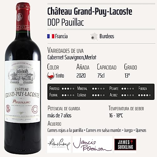 Descubre el exquisito Château Grand-Puy-Lacoste 5ème Grand Cru Classé tinto 2020, un vino de la Denominación de Origen Protegida Pauillac en Burdeos, Francia. Este prestigioso vino, elaborado con las mejores variedades de uva Cabernet Sauvignon y Merlot, es una elección perfecta para los amantes del buen vino, especialmente aquellos que buscan un producto de alta calidad para ocasiones especiales o para disfrutar en casa. Con una impresionante puntuación de 94+/100 por Robert Parker, este vino promete deleitar tus sentidos y enriquecer tus momentos de celebración.
