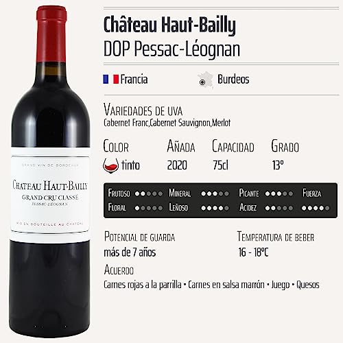 Château Haut-Bailly tinto 2020 se distingue por su complejidad y elegancia. Con una intensa capa color rubí, este vino presenta aromas exuberantes de frutas rojas maduras, como cerezas y frambuesas, junto a sutiles notas especiadas y de roble. En boca, es suave y sedoso, con taninos bien integrados que ofrecen una estructura equilibrada y un final persistente. Su proceso de vinificación meticuloso, que incluye la fermentación en tinas de madera y un envejecimiento cuidadoso en barricas, realza su potencial aromático y de envejecimiento, permitiendo que los sabores se desarrollen de manera excepcional.