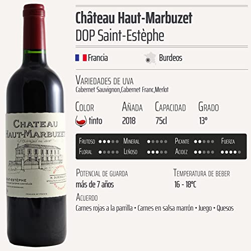 Descubre el aclamado Château Haut-Marbuzet Saint-Estèphe tinto 2018, un vino de Denominación de Origen Protegida (DOP) de Burdeos, Francia. Este exquisito tinto, elaborado con una mezcla de variedades de uva Cabernet Sauvignon, Cabernet Franc y Merlot, es perfecto para los amantes del vino que buscan una experiencia sensorial única. Ideal para maridar con carnes rojas, quesos curados, o disfrutar en una cena especial. Su elegancia y complejidad lo convierten en una excelente elección tanto para coleccionistas como para aquellos que simplemente quieren deleitarse con un buen vino.
