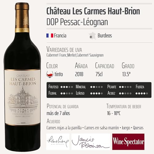 Descubre el excepcional Château Les Carmes Haut-Brion tinto 2018, un vino con Denominación de Origen Protegida (DOP) Pessac-Léognan, situado en la famosa región de Burdeos, Francia. Este vino tinto, elaborado a partir de una cuidadosa mezcla de variedades de uva Cabernet Franc, Merlot y Cabernet Sauvignon, ofrece una experiencia de cata inigualable. Con una puntuación impresionante de 96+/100 por Robert Parker, este vino es ideal para los amantes del buen vino que buscan un producto de alta gama para ocasiones especiales o para enriquecer su colección de vinos.