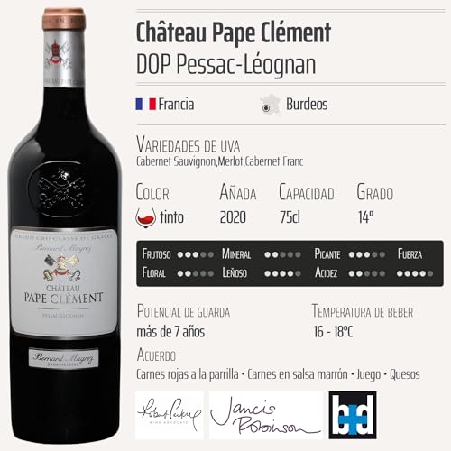 El Château Pape Clément tinto 2020 destaca por su complejidad y elegancia. Su aroma ofrece notas de frutas negras maduras, especias y un sutil toque de roble, gracias a su envejecimiento en barricas. En boca, es un vino potente y equilibrado, con taninos sedosos que prometen un excelente potencial de envejecimiento. Su característico final largo y persistente lo convierte en una experiencia memorable. Este vino no solo es un deleite para el paladar, sino que también representa la tradición vitivinícola de Burdeos, ideal para aquellos que buscan un producto de alta gama.