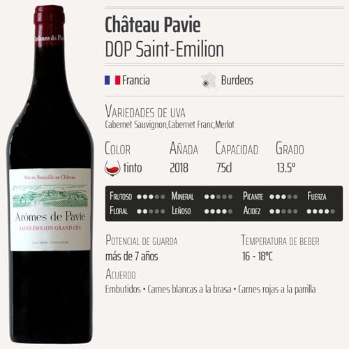 El Château Pavie Saint-Emilion Arômes de Pavie se distingue por su complejidad y equilibrio. A la vista, presenta un color rojo profundo que promete intensidad. En nariz, se aprecian aromas de frutas maduras, notas de especias y un ligero toque mineral que habla de su terroir único. En boca, el vino se siente robusto y bien estructurado, con taninos suaves y un final largo que invita a repetir. Este vino no solo realza el momento, sino que también es perfecto para maridar con carnes rojas, platos de caza y quesos curados, convirtiéndose en una elección versátil para cualquier comida.