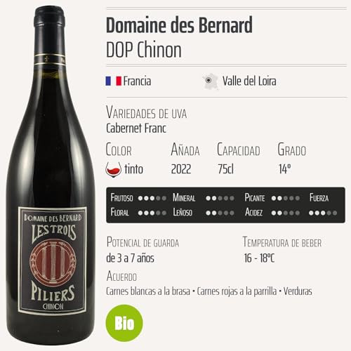 El Chinon Les Trois Piliers destaca por su proceso de vinificación orgánica, que garantiza un respeto total por el medio ambiente y la biodiversidad. Este vino se caracteriza por su color rojo profundo y sus aromas intensos de frutos rojos, como la cereza y la frambuesa, junto con sutiles notas herbáceas. En boca, ofrece una estructura equilibrada, con taninos suaves que se integran a la perfección con su frescura, lo que lo hace ideal para disfrutar ahora o guardar en tu bodega para un futuro cercano. Su versatilidad en maridaje permite combinarlo con platos de carne, quesos y guisos.