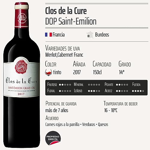Descubre el Clos de la Cure MAGNUM tinto 2017, un exquisito vino de la Denominación de Origen Protegida (DOP) Saint-Emilion, en la renombrada región de Burdeos, Francia. Este vino, elaborado con las variedades de uva Merlot y Cabernet Franc, es una elección sobresaliente para los amantes del vino que buscan una experiencia única. Con un formato de 3 botellas de 150cl, es ideal para ocasiones especiales, celebraciones o simplemente para disfrutar de una velada inolvidable. Su elegancia y sofisticación lo convierten en un regalo perfecto o en una pieza central para cualquier mesa.
