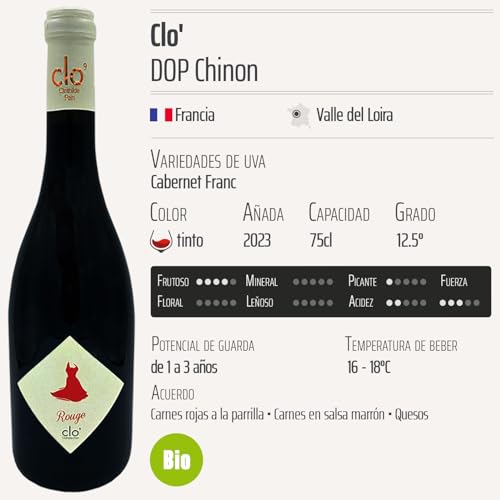 Descubre el Clo’ Chinon Robe tinto 2023, un vino excepcional de la región del Valle del Loira en Francia. Este vino tinto orgánico, protegido por la Denominación de Origen Protegida (DOP), se elabora a partir de las finas uvas Cabernet Franc, ofreciendo un viaje sensorial único en cada copa. Ideal para conocedores de vino y aficionados que buscan productos saludables y sostenibles, Clo’ Chinon es perfecto para acompañar comidas, celebraciones o simplemente disfrutar en una tarde relajada.