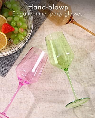 Artesanía tradicional: nuestras exquisitas copas de vino de cristal de colores, meticulosamente elaboradas por artesanos experimentados que dedican al menos 5 minutos a soplar a mano cada copa a la perfección. Estas copas de vino cuentan con una elegancia y belleza inigualables, superando con creces los vasos de plástico baratos hechos a máquina o vasos desechables que inundan el mercado.