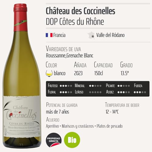 Descubre el Côtes du Rhône Magnum blanco 2023 – Orgánico – Château des Coccinelles, un vino excepcional que proviene del célebre Valle del Ródano en Francia. Este vino, elaborado con variedades de uva Roussanne y Grenache Blanc, es perfecto para quienes buscan una experiencia vinícola única y sostenible. Con su formato de 3×150 cl, es ideal para celebraciones, reuniones familiares o cenas con amigos. Disfruta de la frescura y elegancia de este vino orgánico, pensado para los amantes del vino que valoran la calidad y la producción responsable.
