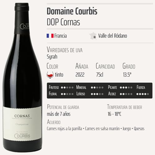 El Cornas Champelrose tinto 2022 destaca por su carácter intenso y su perfil aromático excepcional. En nariz, ofrece notas de frutos negros maduros, especias y un sutil toque de roble, mientras que en boca resalta su estructura robusta y taninos finos, que proporcionan un agradable final. Este vino expresa a la perfección el terruño del Valle del Ródano, presentando una acidez equilibrada que le brinda una gran capacidad de envejecimiento. Es ideal para maridar con carnes rojas, caza y quesos curados, convirtiéndolo en una opción versátil para cualquier ocasión.