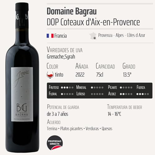 Descubre el Coteaux d’Aix-en-Provence Jovic tinto 2022 del Domaine Bagrau, una joya vitivinícola de la región de Provenza, Alpes y Côtes d’Azur en Francia. Este vino DOP (Denominación de Origen Protegida) es la elección perfecta para los amantes del vino que buscan una experiencia sensorial única, caracterizada por su elegancia y complejidad. Ideal tanto para ocasiones especiales como para disfrutar en una cena informal, el Jovic tinto 2022 promete deleitar tu paladar con su equilibrio excepcional entre las variedades de uva Grenache y Syrah.