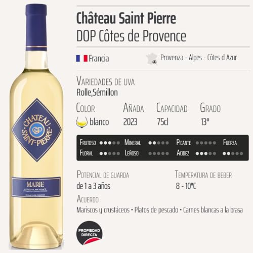 Descubre el exquisito Côtes de Provence Marie blanco 2023, un vino DOP de Château Saint Pierre que proviene de la hermosa región de Provenza, en la costa de los Alpes y la Côtes d’Azur, Francia. Con un blend de variedades de uva Rolle y Sémillon, este vino es perfecto para los amantes del vino que buscan una experiencia refrescante y elegante. Ideal para cenas al aire libre, picnics o simplemente para disfrutar en buena compañía, el Côtes de Provence Marie blanco se convierte en el acompañamiento perfecto para platos de mariscos, ensaladas y aperitivos.