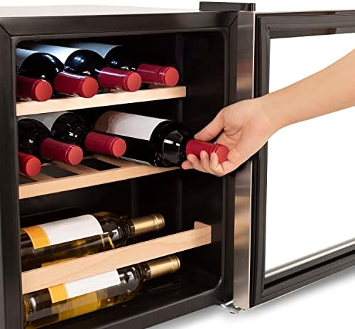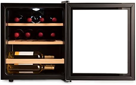 Vinoteca eléctrica con capacidad para 12 o 15 botellas (dependiendo de su organización). Cuenta con un rango térmico regulable de 4°C a 18°C. Con baldas de madera natural de Haya, diseñadas con la inclinación exacta para la correcta conservación del vino.