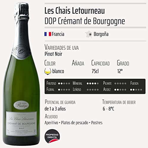 Descubre la elegancia y sofisticación del Crémant de Bourgogne Cuvée Prestige Brut blanco de Les Chais Letourneau. Este vino espumoso de Denominación de Origen Protegida (DOP) de Borgoña, Francia, está elaborado a partir de las selectas variedades de uva Pinot Noir. Perfecto para celebraciones y momentos especiales, este pack de 6 botellas de 75 cl es el acompañamiento ideal para aquellos que buscan una experiencia burbujeante de alta calidad. Su frescura y complejidad lo convierten en una elección destacada para los amantes del vino espumoso y la gastronomía.