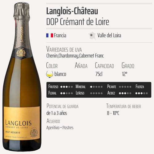 Descubre el Crémant de Loire Brut Réserve blanco de Langlois-Château, una joya del Valle del Loira en Francia. Este vino espumoso, elaborado bajo la Denominación de Origen Protegida (DOP), es perfecto para aquellos que buscan una experiencia sensorial única. Con su mezcla de variedades de uva Chenin, Chardonnay y Cabernet Franc, este crémant es ideal para celebraciones, cenas elegantes o simplemente para disfrutar en buena compañía. Si eres un amante del vino o buscas un regalo especial, esta botella de 75cl (12 unidades) será sin duda un acierto.