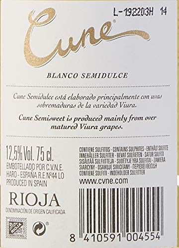 El vino blanco semidulce de Cune es un vino de color paja pálido con ligeras reminiscencias verdosas. En nariz buen equilibrio entre los aromas de fruta blanca, frutos secos y ahumados. En boca gracias entrada sedosa, fresca, con un ligero dulzor. Está elaborado con uvas de la variedad Viura.