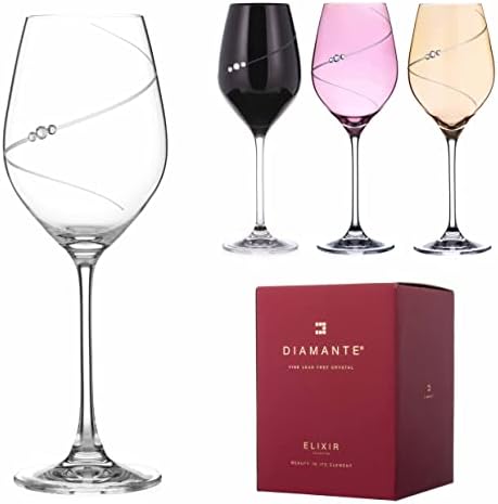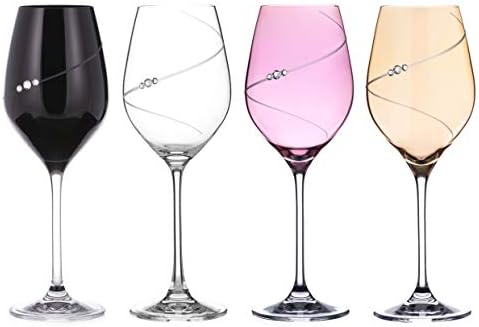 Juego de 4 copas de vino blanco Swarovski de colores con diseño de silueta. Esta colección contiene un vaso en color rosa, negro, ámbar y transparente. Cada vaso cuenta con el mismo diseño cortado a mano y está acabado con 3 cristales de Swarovski.