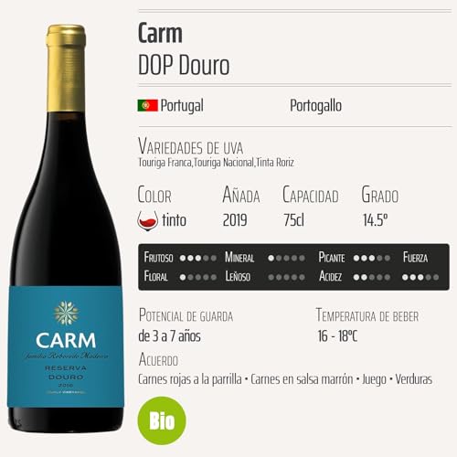 Descubre el Douro Reserva Tinto 2019, un vino orgánico de la reconocida bodega Carm, que cuenta con Denominación de Origen Protegida (DOP) de Portugal. Este espléndido vino tinto, elaborado con las variedades de uva Touriga Franca, Touriga Nacional y Tinta Roriz, es perfecto para los amantes del vino que buscan una experiencia única y sostenible. Ideal para maridar con platillos exquisitos, el Douro Reserva es una opción espectacular para cenas especiales, celebraciones o simplemente para disfrutar en casa después de un largo día.