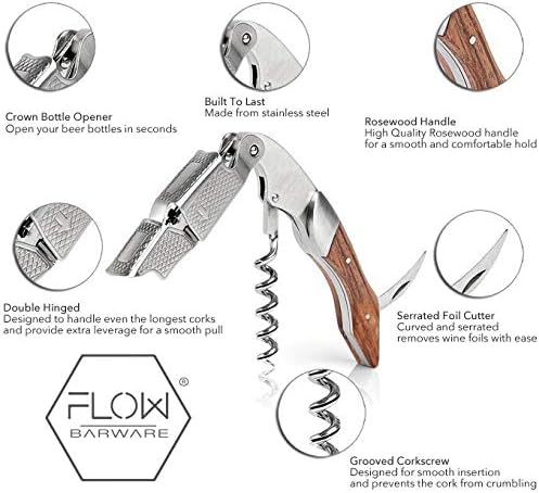 Con un abridor de botellas de corona, un cortador de lámina dentada y un sacacorchos acanalado, esta herramienta de barra imprescindible está diseñada para durar con un fuerte cuerpo de acero inoxidable y mango de palisandro suave para un manejo cómodo junto con un fulcro de doble bisagra que garantiza un apalancamiento óptimo para el tirón suave incluso de los corchos más difíciles.