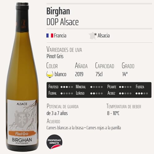 Descubre el Genérico Alsace Pinot Gris blanco 2019 de Birghan, un vino blanco de Denominación de Origen Protegida (DOP) de Alsacia, Francia. Este vino, elaborado con uvas de la variedad Pinot Gris, destaca por su frescura y versatilidad, siendo una opción ideal para los amantes del vino que buscan un producto de calidad para comidas, celebraciones o simplemente para disfrutar en casa. Perfecto para maridar con pescados, mariscos y platos ligeros, este vino es una elección excelente para quienes desean explorar y apreciar los sabores únicos de la región de Alsacia.
