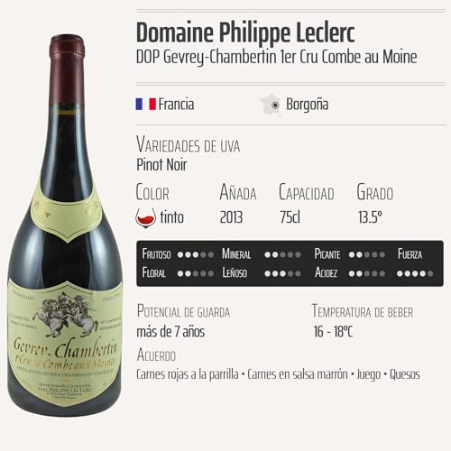 El Gevrey-Chambertin 1er Cru Combe au Moine 2013 se distingue por su elegancia y complejidad. Su color rubí profundo anticipa un perfil aromático donde se entrelazan notas de frutas rojas maduras, suaves especias y un sutil toque de tierra que aportan un carácter único. En boca, se presenta con una estructura equilibrada, taninos sedosos y una acidez refrescante que realza su longevidad en el tiempo. Este vino refleja las particularidades del terruño de Borgoña, donde el clima, el suelo y la experiencia vitivinícola del Domaine Philippe Leclerc se combinan para crear un producto excepcional.