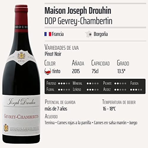 El Gevrey-Chambertin tinto 2015 se distingue por su profunda intensidad y complejidad aromática. Presenta notas de frutas rojas frescas, como cerezas y frambuesas, que se complementan con toques sutiles de especias y un ligero matiz terroso que refleja el terroir de Borgoña. Este vino es conocido por su elegancia y equilibrio, con taninos finos que ofrecen una textura sedosa en boca. Su excelente capacidad de envejecimiento también lo convierte en una opción atractiva para los aficionados que buscan mejorar su colección.