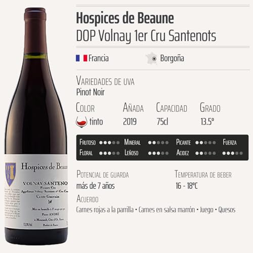 Descubre el maravilloso Hospices de Beaune Volnay 1er Cru Santenots Cuvée Gauvain tinto 2019, un vino de Denominación de Origen Protegida que proviene de la icónica región de Borgoña en Francia. Elaborado a partir de la célebre variedad de uva Pinot Noir, este vino no solo cautiva los sentidos con su complejidad, sino que también ofrece un equilibrio excepcional entre elegancia y estructura. Perfecto para los amantes del vino y coleccionistas, es ideal para maridar con comidas gourmet o disfrutar en ocasiones especiales.