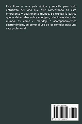 Este libro es una guía rápida y sencilla para todo entusiasta del vino que este comenzando en este interesante y apasionantemundo. Se explica lo básico que se debe saber sobre el origen, principales vinos del mundo, así como el maridaje o acompañamientos gastronómicos, así como el uso de los sentidos para una cata profesional.