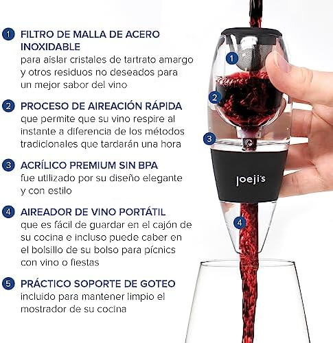 Accesorio vino compacto y que ahorra espacio – este set vino no ocupará espacio en su cocina como un voluminoso decantador aireador. El escanciador de vino se puede llevar para picnics o fiestas. Viene con un soporte de exhibición para mantener su mostrador limpio y evitar que se caiga.